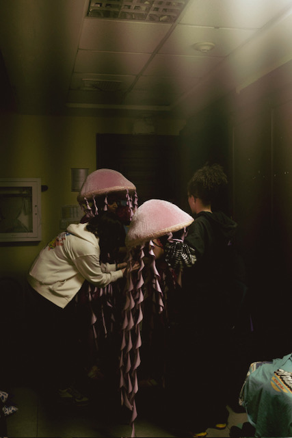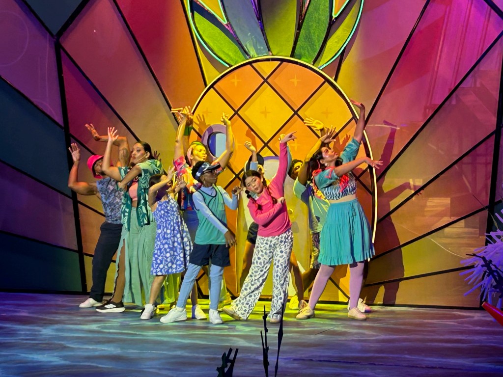 A nuestro alrededor, solo sigo admirando al ensamble. Ahí están las actrices, en un momento medusas y de repente bailarinas de tap, para luego ponerse unos pompones una, una sotana negra la otra, en lo que los actores pasan de bailarín de rap o de protestante anti ardillas, a musculoso pececillo, o ayudante moviendo el escenario portátil que hace las veces de un volcán. Los admiro mucho porque cuando los ves desde la butaca de espectador siempre están ahí representando todas las emociones que le corresponden al papel que representan, sin que uno sepa por un momento que pudieron haber tenido algún problema con algún botón que se despega, un nudo de corbata que se desarma, o un prop que decide atorarse segundos antes de entrar a escena. Profesionales a más no poder en lo suyo.